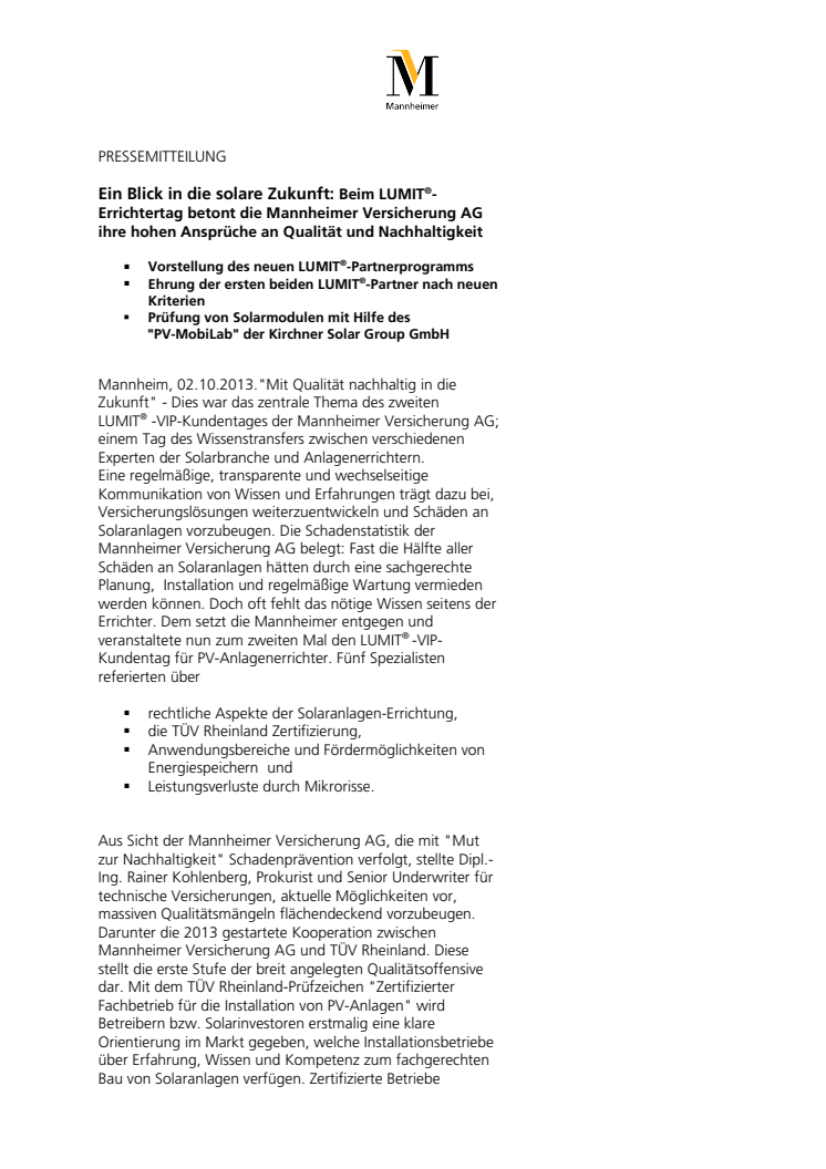 Ein Blick in die solare Zukunft: Beim LUMIT®-Errichtertag betont die Mannheimer Versicherung AG ihre hohen Ansprüche an Qualität und Nachhaltigkeit