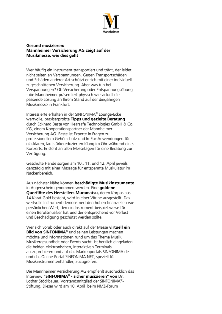 Gesund musizieren: Mannheimer Versicherung AG zeigt auf der Musikmesse, wie dies geht