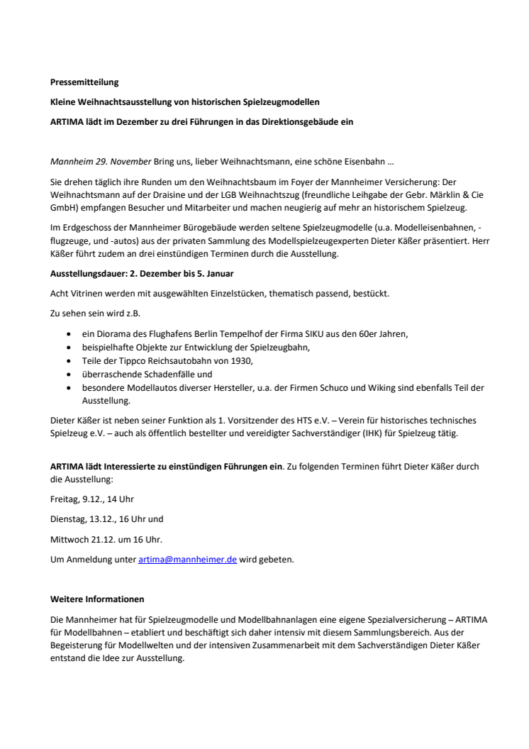 Pressemitteilung: Kleine Weihnachtsausstellung von historischen Spielzeugmodellen (PDF)