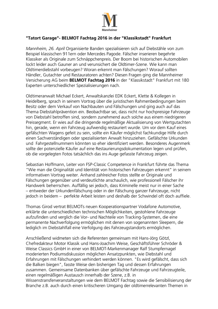 Wie kann man Oldtimerdiebstahl vorbeugen? Woran erkennt man Fälschungen? Worauf sollten Händler, Gutachter und Restauratoren achten? Diesen Fragen ging die Mannheimer Versicherung AG beim BELMOT Fachtag 2016 in der "Klassikstadt" Frankfurt mit 180 Experten unterschiedlicher Spezialisierungen nach.