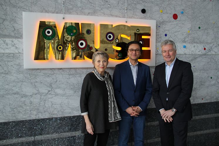 Foto: v.l.n.r. Linde Hollinger, Babak Saed, Jürgen Wörner bei der offiziellen Übergabe von „MUSE“ (Bild: Mannheimer Versicherung AG, © VG Bild-Kunst, Bonn 2019)
