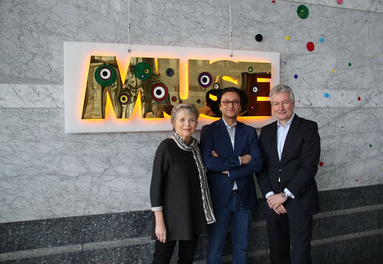 Foto: v.l.n.r. Linde Hollinger, Babak Saed, Jürgen Wörner bei der offiziellen Übergabe von „MUSE“ (Bild: Mannheimer Versicherung AG, © VG Bild-Kunst, Bonn 2019)