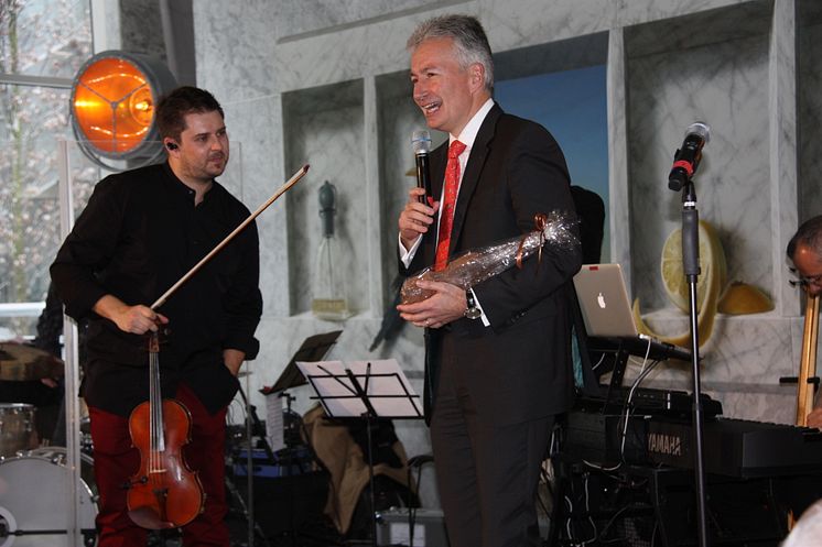 SINFONIMA Adventsmatinée - Vorstand der MVG Jürgen Wörner übergibt Schokoladengeige an Stefan Krznaric