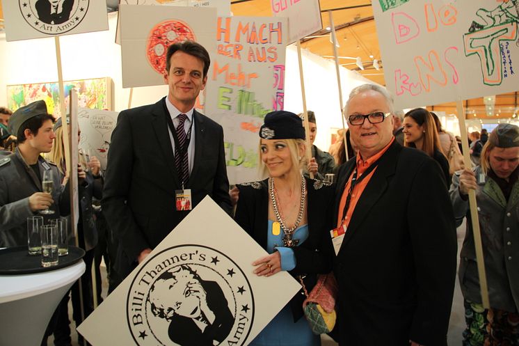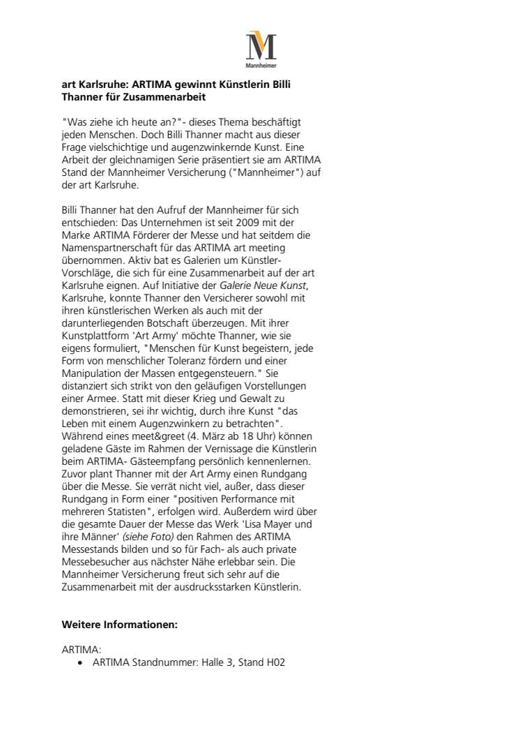 Billi Thanner hat den Aufruf der Mannheimer für sich entschieden: Das Unternehmen ist seit 2009 mit der Marke ARTIMA Förderer der Messe und hat seitdem die Namenspartnerschaft für das ARTIMA art meeting übernommen. Aktiv bat es Galerien um Künstler-Vorschläge, die sich für eine Zusammenarbeit auf der art Karlsruhe eignen. Auf Initiative der Galerie Neue Kunst, Karlsruhe, konnte Thanner den Versicherer sowohl mit ihren künstlerischen Werken als auch mit der darunterliegenden Botschaft überzeugen. Mit ihrer Kunstplattform 'Art Army' möchte Thanner, wie sie eigens formuliert, "Menschen für Kunst begeistern, jede Form von menschlicher Toleranz fördern und einer Manipulation der Massen entgegensteuern." Sie distanziert sich strikt von den geläufigen Vorstellungen einer Armee. Statt mit dieser Krieg und Gewalt zu demonstrieren, sei ihr wichtig, durch ihre Kunst "das Leben mit einem Augenzwinkern zu betrachten".