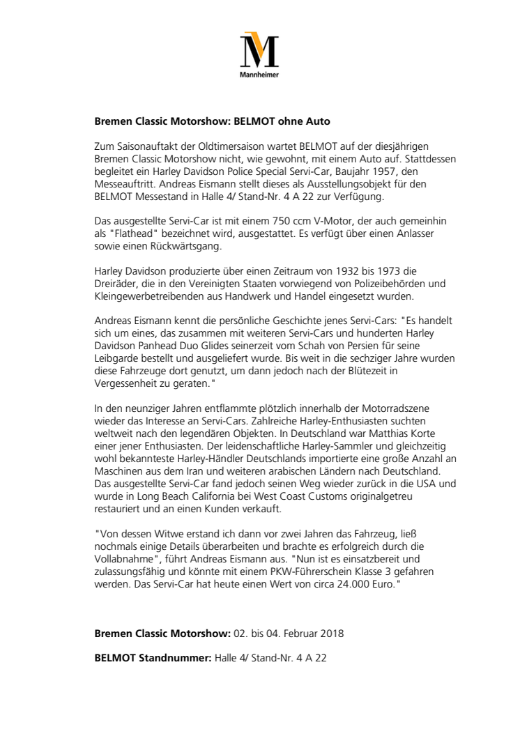 Zum Saisonauftakt der Oldtimersaison wartet BELMOT auf der diesjährigen Bremen Classic Motorshow nicht, wie gewohnt, mit einem Auto auf. Stattdessen begleitet ein Harley Davidson Police Special Servi-Car, Baujahr 1957, den Messeauftritt. Andreas Eismann stellt dieses als Ausstellungsobjekt für den BELMOT Messestand in Halle 4/ Stand-Nr. 4 A 22 zur Verfügung.
