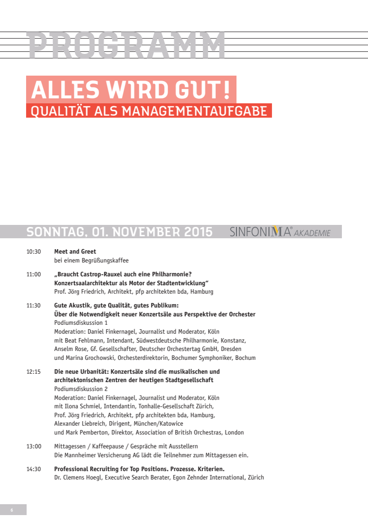 In zwei Podiumsdiskussionen wird bei der SINFONIMA® Akademie die Bedeutung (neuer) Konzertsäle aus verschiedenen, auch internationalen, Perspektiven diskutiert und anschließend über Führungskompetenzen und professionelle Personalauswahl referiert. Außerdem laden mehrere Experten zu Diskussionen in kleinen Runden ein. Die Themen bewegen sich von "Bewerbungsprozessen aus Arbeitgeber- und Arbeitnehmersicht" über "Markenentwicklung" hin zu "Qualitätsmanagement im Orchester". Harald Fröhlich, Leiter der Markenprogramme bei der Mannheimer, wird mit dem Thema "Wie entwickelt man eine Marke im NICHT-Konsumgütersegment?" eine Diskussion am runden Tisch eröffnen. Die Gesamtmoderation der fünf gleichzeitig stattfindenden "Roundtables" übernehmen Susanne Leuthner und Janina Klabes, ebenfalls Mitarbeiterinnen der Mannheimer.