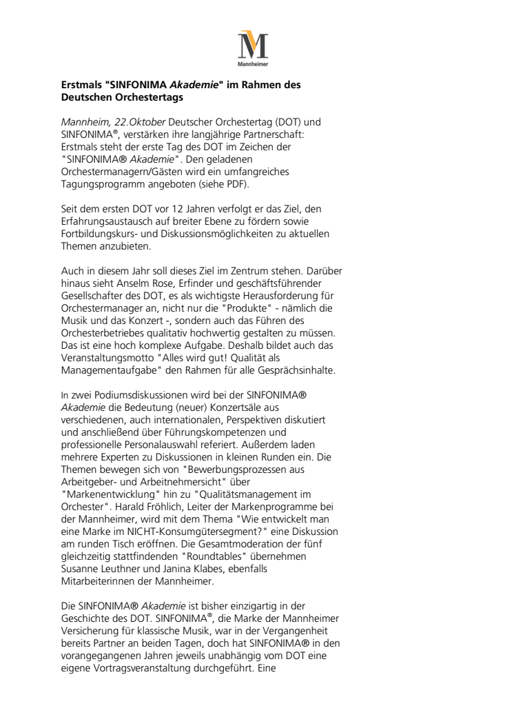 Mannheim, 22.Oktober Deutscher Orchestertag (DOT) und SINFONIMA®, verstärken ihre langjährige Partnerschaft: Erstmals steht der erste Tag des DOT im Zeichen der "SINFONIMA® Akademie". Den geladenen Orchestermanagern/Gästen wird ein umfangreiches Tagungsprogramm angeboten (siehe PDF).
