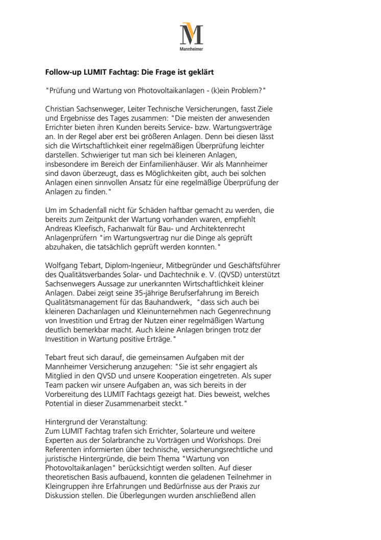 Am 27. Oktober bietet die Mannheimer Versicherung gemeinsam mit dem Qualitätsverband Solar- und Dachtechnik (QVSD) für Interessenten aus dem Norden einen weiteren LUMIT-Fachtag an. Dieser findet in Hannover statt und behandelt das gleiche Thema.