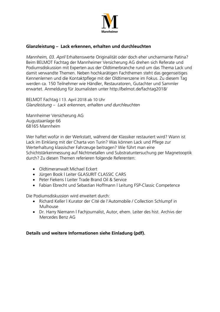 Erhaltenswerte Originalität oder doch eher uncharmante Patina? Beim BELMOT Fachtag der Mannheimer Versicherung AG drehen sich Referate und Podiumsdiskussion mit Experten aus der Oldtimerbranche rund um das Thema Lack und damit verwandte Themen. Neben hochkarätigen Fachthemen steht das gegenseitiges Kennenlernen und die Kontaktpflege mit der Oldtimerszene im Fokus. Zu diesem Tag werden ca. 150 Teilnehmer wie Händler, Restauratoren, Gutachter und Sammler erwartet.