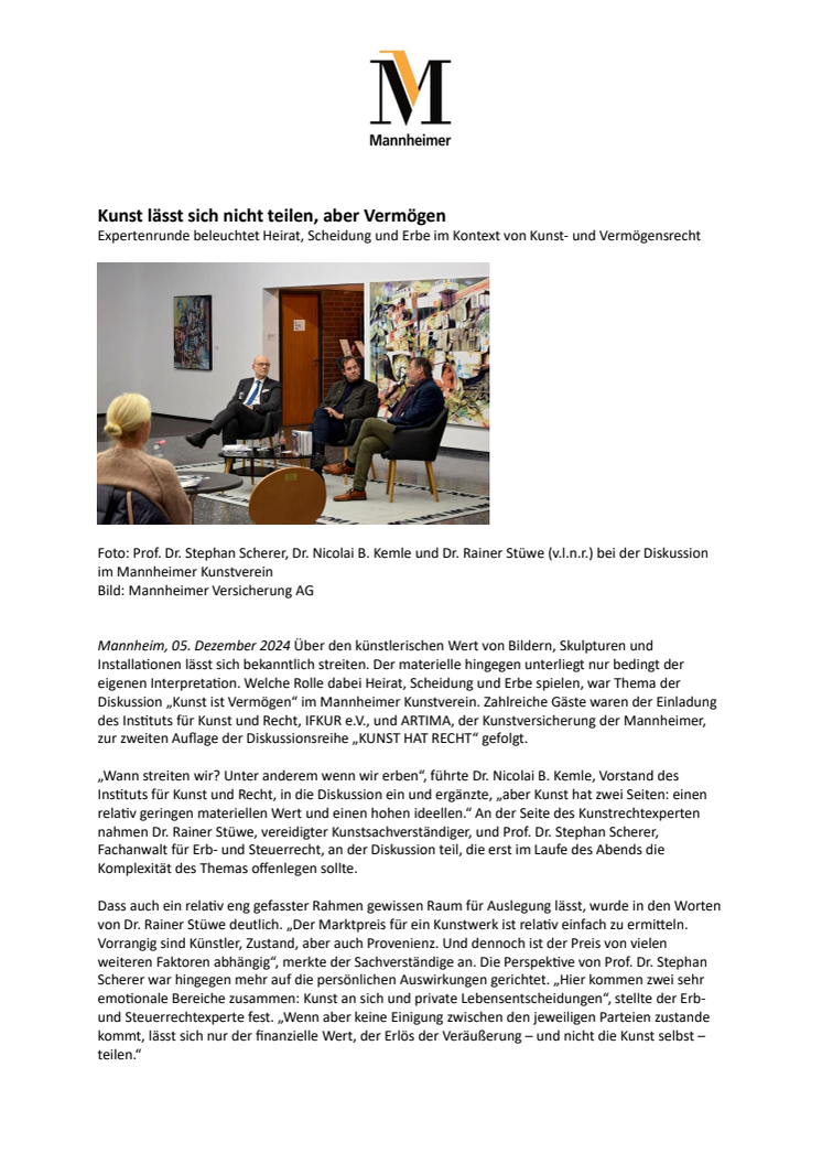 Über den künstlerischen Wert von Bildern, Skulpturen und Installationen lässt sich bekanntlich streiten. Der materielle hingegen unterliegt nur bedingt der eigenen Interpretation. Welche Rolle dabei Heirat, Scheidung und Erbe spielen, war Thema der Diskussion „Kunst ist Vermögen“ im Mannheimer Kunstverein. Zahlreiche Gäste waren der Einladung des Instituts für Kunst und Recht, IFKUR e.V., und ARTIMA, der Kunstversicherung der Mannheimer, zur zweiten Auflage der Diskussionsreihe „KUNST HAT RECHT“ gefolgt.