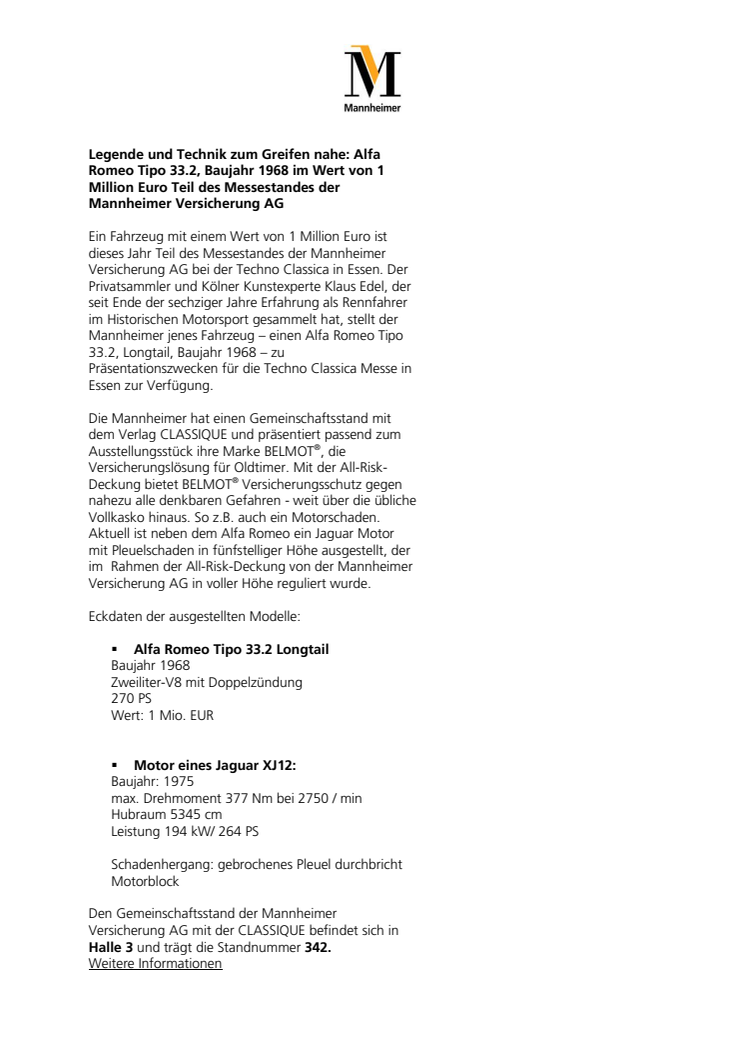 Ein Fahrzeug mit einem Wert von 1 Million Euro ist dieses Jahr Teil des Messestandes der Mannheimer Versicherung AG bei der Techno Classica in Essen. Der Privatsammler und Kölner Kunstexperte Klaus Edel, der seit Ende der sechziger Jahre Erfahrung als Rennfahrer im Historischen Motorsport gesammelt hat, stellt der Mannheimer jenes Fahrzeug – einen Alfa Romeo Tipo 33.2, Longtail, Baujahr 1968 – zu Präsentationszwecken für die Techno Classica Messe in Essen zur Verfügung.