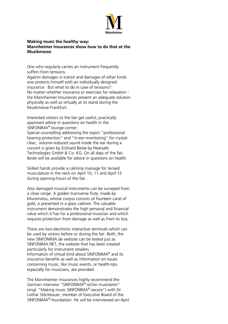 The Mannheimer Insurances highly recommend the German interview "SINFONIMA®-sicher musizieren" (engl. "Making music SINFONIMA®-secure") with Dr. Lothar Stöckbauer, member of Executive Board of the SINFONIMA®-foundation. He will be interviewed on April 10 at the NMZ-Forum (stand of the "Neue Musikzeitung", Hall 3.1., Stand D41) at 5 p.m. Afterwards, the audience is invited to ask questions.