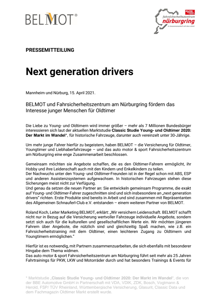 Roland Koch, Leiter Marketing BELMOT, erklärt: „Wir versichern Leidenschaft. BELMOT schafft nicht nur in Bezug auf die Versicherung wertvoller Fahrzeuge individuelle Angebote, sondern setzt sich auch für die kulturellen und gesellschaftlichen Werte ein. Wir möchten jüngeren Fahrern über Angebote, die nützlich sind und gleichzeitig Spaß machen, wie z.B. ein Fahrsicherheitstraining mit dem Oldtimer, einen leichteren Zugang zu Oldtimern und Youngtimern ermöglichen.“