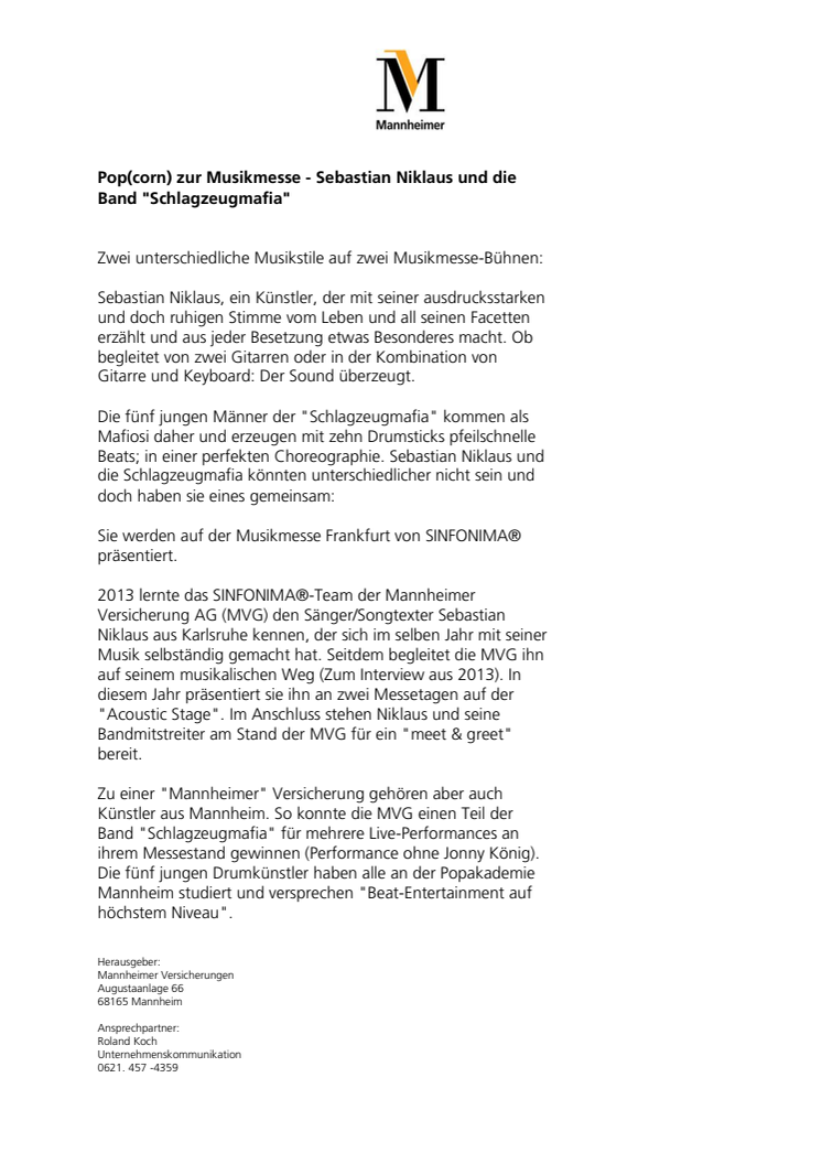 2013 lernte das SINFONIMA®-Team der Mannheimer Versicherung AG (MVG) den Sänger/Songtexter Sebastian Niklaus aus Karlsruhe kennen, der sich im selben Jahr mit seiner Musik selbständig gemacht hat. Seitdem begleitet die MVG ihn auf seinem musikalischen Weg (Zum Interview aus 2013). In diesem Jahr präsentiert sie ihn an zwei Messetagen auf der "Acoustic Stage". Im Anschluss stehen Niklaus und seine Bandmitstreiter am Stand der MVG für ein "meet & greet" bereit.