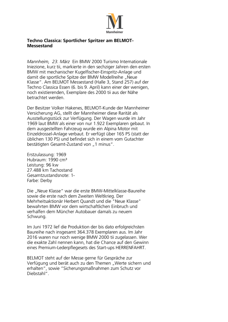 Der Besitzer Volker Hakenes, BELMOT-Kunde der Mannheimer Versicherung AG, stellt der Mannheimer diese Rarität als Ausstellungsstück zur Verfügung. Der Wagen wurde im Jahr 1969 laut BMW als einer von nur 1.922 Exemplaren gebaut. In dem ausgestellten Fahrzeug wurde ein Alpina Motor mit Einzeldrossel-Anlage verbaut. Er verfügt somit über 165 PS (statt der üblichen 130 PS) und befindet sich in einem vom Gutachter bestätigten Gesamt-Zustand von „1 minus“.