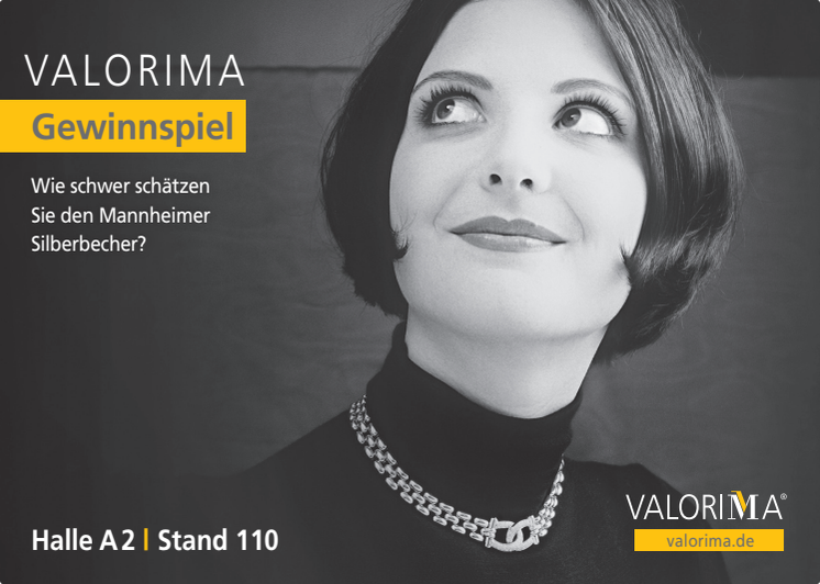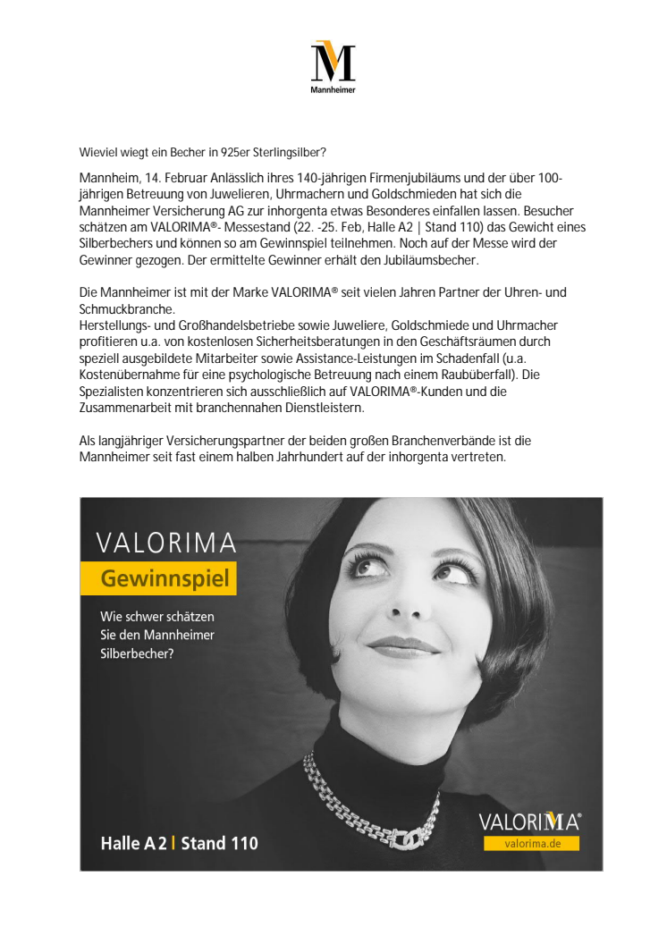 Anlässlich ihres 140-jährigen Firmenjubiläums und der über 100-jährigen Betreuung von Juwelieren, Uhrmachern und Goldschmieden hat sich die Mannheimer Versicherung AG zur inhorgenta etwas Besonderes einfallen lassen. Besucher schätzen am VALORIMA®- Messestand (22. -25. Feb, Halle A2 | Stand 110) das Gewicht eines Silberbechers und können so am Gewinnspiel teilnehmen. Noch auf der Messe wird der Gewinner gezogen. Der ermittelte Gewinner erhält den Jubiläumsbecher.